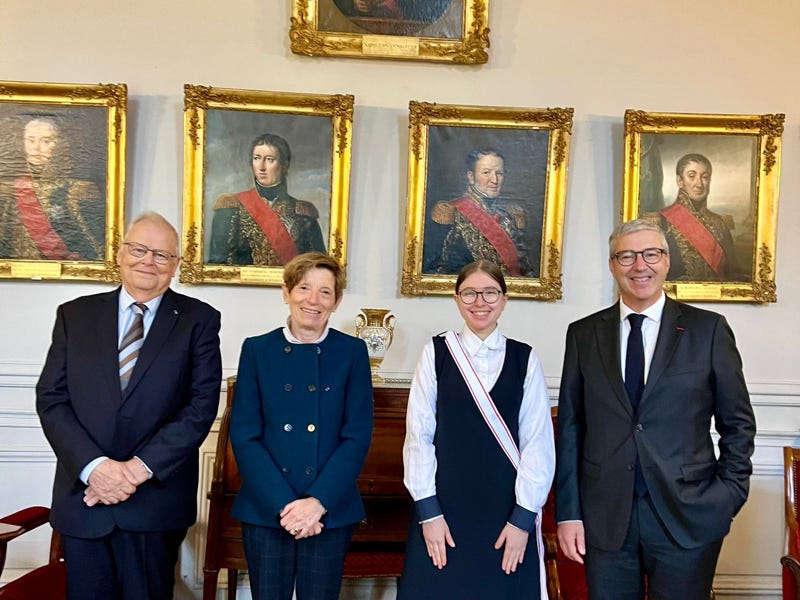 Madame Maraux, Surintendante des Maisons d’éducation de la Légion d’honneur, a reçu Monsieur Chaleix, notre ancien Dasen, nommé Inspecteur général de l’Education nationale, ainsi que Madame Dujany, Présidente nationale de l’AMOPA. Monsieur Chaleix et Madame Dujany ont revu à cette occasion Mlle Ambre Lambert-Toledano, notre lauréate départementale qui a obtenu cette année le Grand prix de la jeune poésie de l’AMOPA.