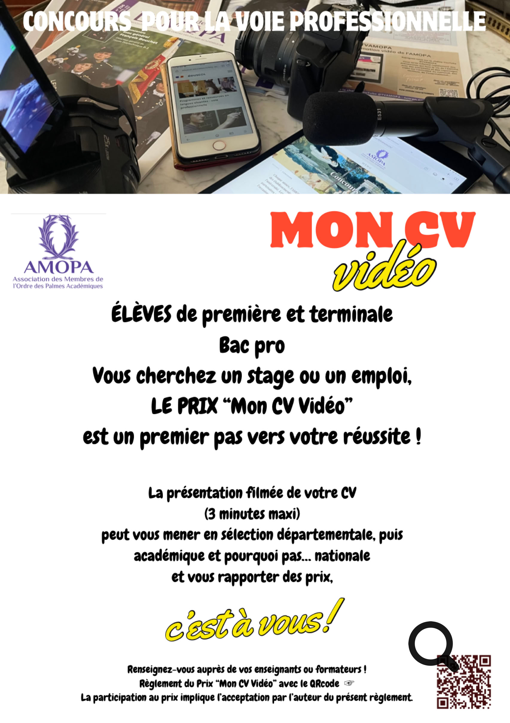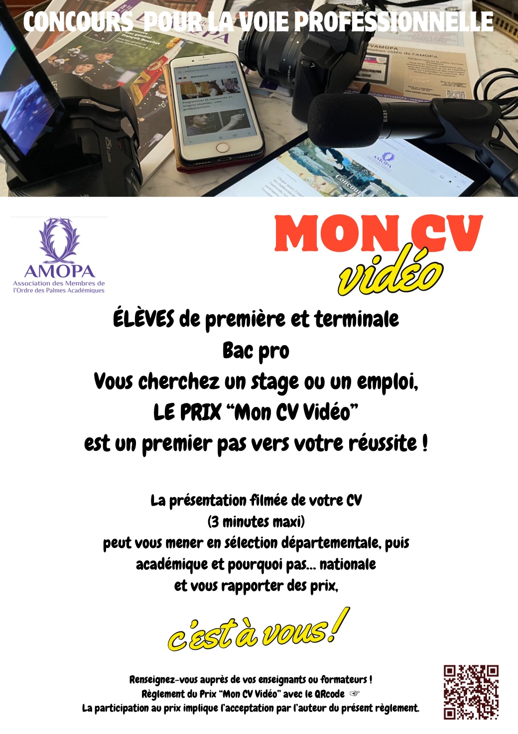 Le Prix intitulé « Mon CV vidéo » s’adresse aux bacheliers professionnels en première et terminale qui sont à la recherche d‘un stage en entreprise ou de leur premier emploi.